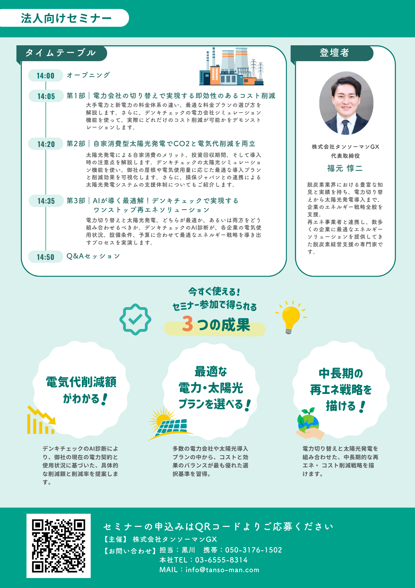 株式会社タンソーマンGX(本社:東京都品川区、代表取締役:福元 惇二)は、電気代の最適化とCO2排出量削減を目指す企業様を対象とした無料ハイブリッドセミナー「電気代が上がる前に!会社の電気を最適化しませんか?」を2025年11月26日(水)に開催することをお知らせいたします。