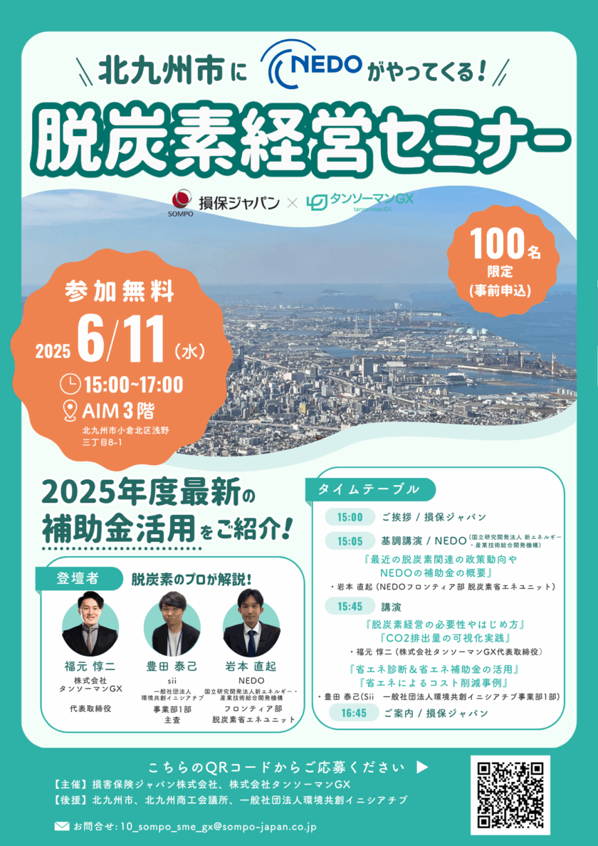 【参加無料・100名限定】北九州市脱炭素経営セミナー― NEDO・Sii・タンソーマンGXが登壇【損保ジャパン/タンソーマンGX主催】